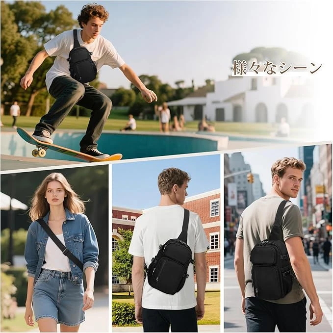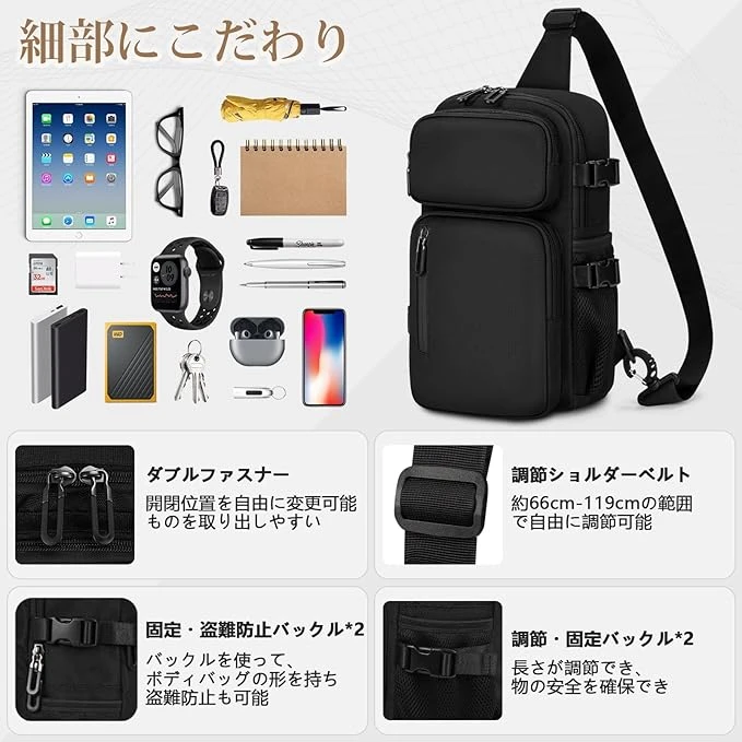 Outstanding Storage Capacity: This body bag has 8 pockets, and the main pocket can hold a 9.7-inch iPad, glasses, notebook, power bank, keys, pens. Inside it is equipped with a zipper pocket, so you can store a long wallet, trifold wallet, etc. The exterior also has 1 pocket for easy access to items, 1 front zipper pocket, pocket for small items and 2 side pockets, so you can store a folding umbrella, water bottle, business cards, notepad, mask stand. Furthermore, there is an anti-theft pocket on the back to easily store your valuables, cell phone, wallet, driver's license, etc