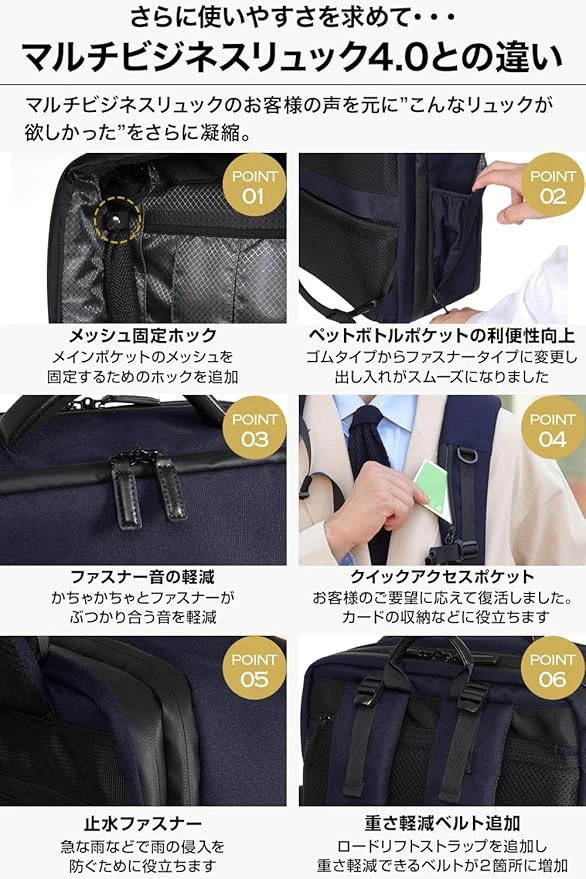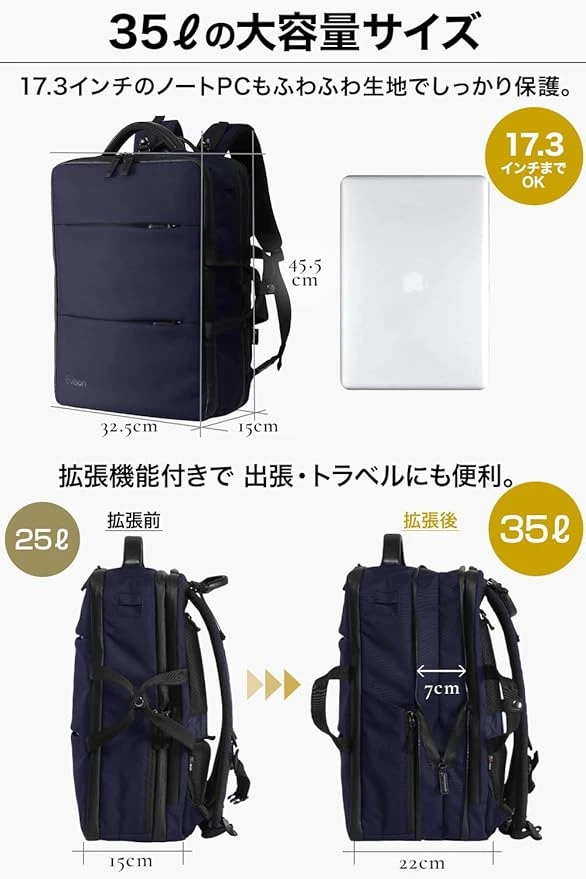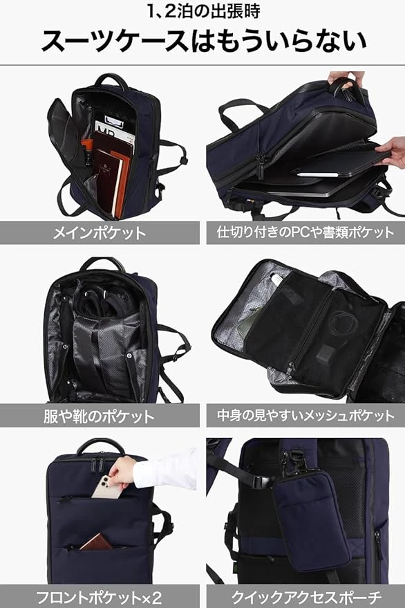 [Function Description] We have further consolidated the features you wanted. Large capacity of 10.8 gal (35 L) / 3 locations for security / 2-layer construction for easy storage / 2-way model / Water repellent / YKK zipper / Mesh fastening hook / 2 plastic bottle pockets / Reduces zipper noise / Chest belt / Compatible with 15.6-inch laptops / Expandable function / Can be used like a suitcase / Does not require a suitcase for business trip / Comes with rear security pocket / Quick access pouch USB Vent/Suit A multi-functional bag that can be used to secure the case, etc. at a low cost