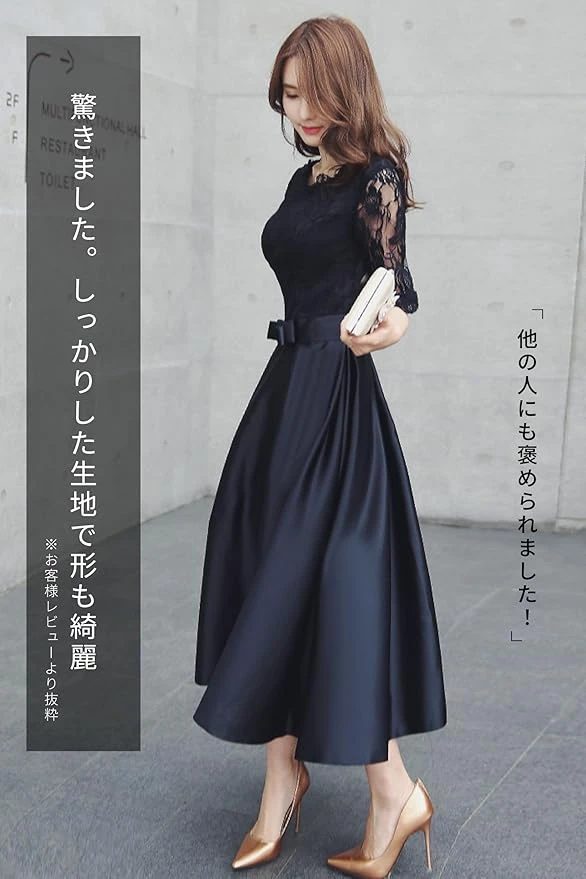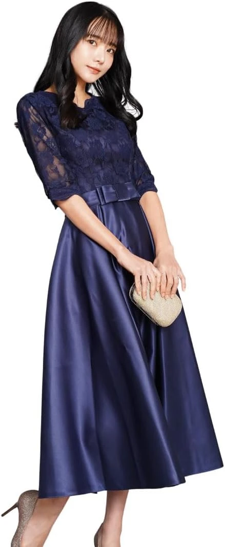 FASHIONFAN official Royal Lace satin elegance dress. [Elegant mid-calf length for a beautiful leg effect] The design is planned to show the thin part of your ankles to make your entire legs look thinner. The silhouette gently sways with every move and accentuates your femininity. Magical Silhouette: The high-waist design and fluffy skirt cover the areas of concern, while accentuating the beautiful lines. Just put it on and start your special day! This party dress will make you feel like it is
