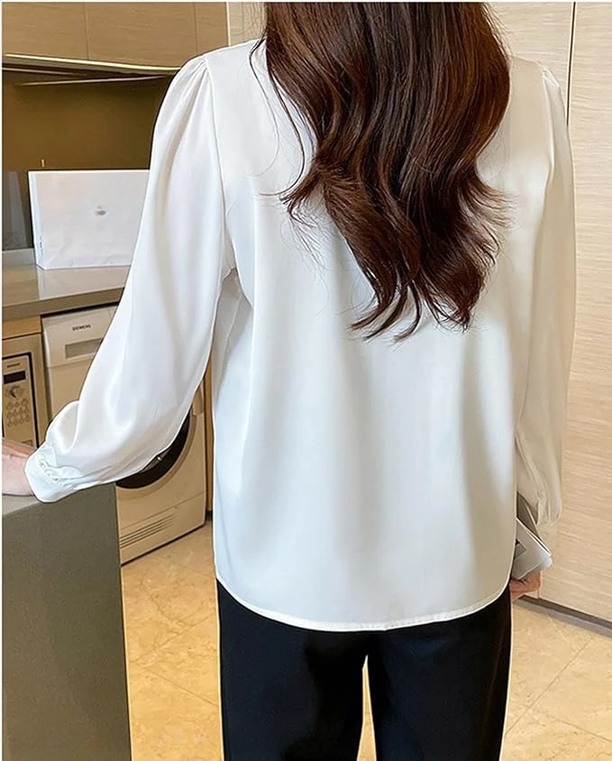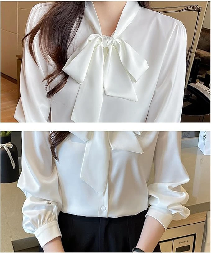 This bowtie blouse is made of soft and high quality fabric, and the loose design gives off a mature and fashionable impression A fashionable and seasonal ribbon shirt that is perfect for all seasons, with excellent slimming effects The ribbon knot gives off a mature charm, and can be worn neatly and mature